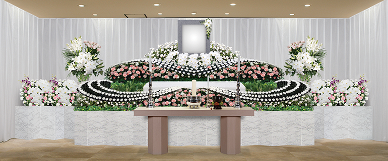 優しくあたたかなデザインの生花祭壇を、経験豊富な専門スタッフが心をこめてお飾りし、